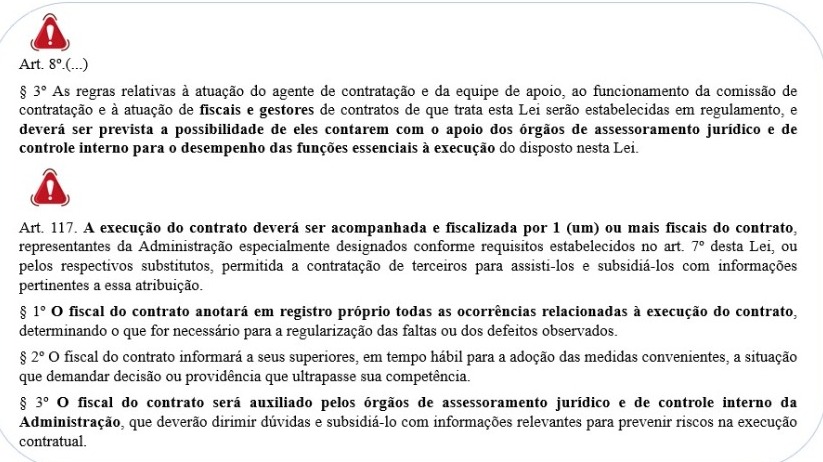 Sobre os Agentes de Gestão e Fiscalização a Lei Federal 14.133/2021, traz inovações no âmbito da gestão e fiscalização dos contratos e o suporte da Assessoria Jurídica e do Controle Interno.