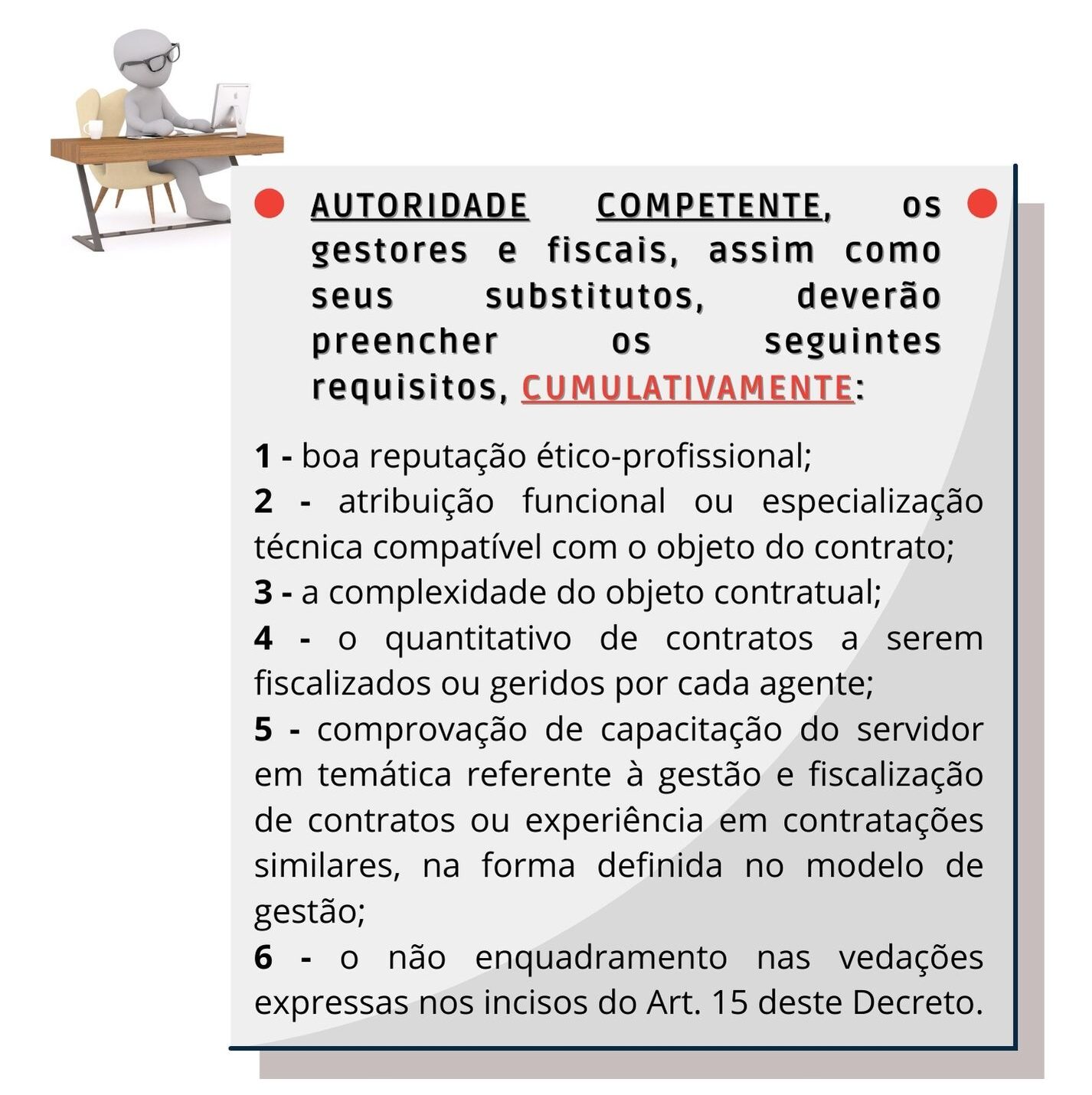 Em regulamentação o art. 6º do Decreto de Gestão e Fiscalização das Contratações Públicas, identifica-se que os gestores e fiscais, bem como dos respectivos substitutos, deverão preencher os seguintes requisitos: