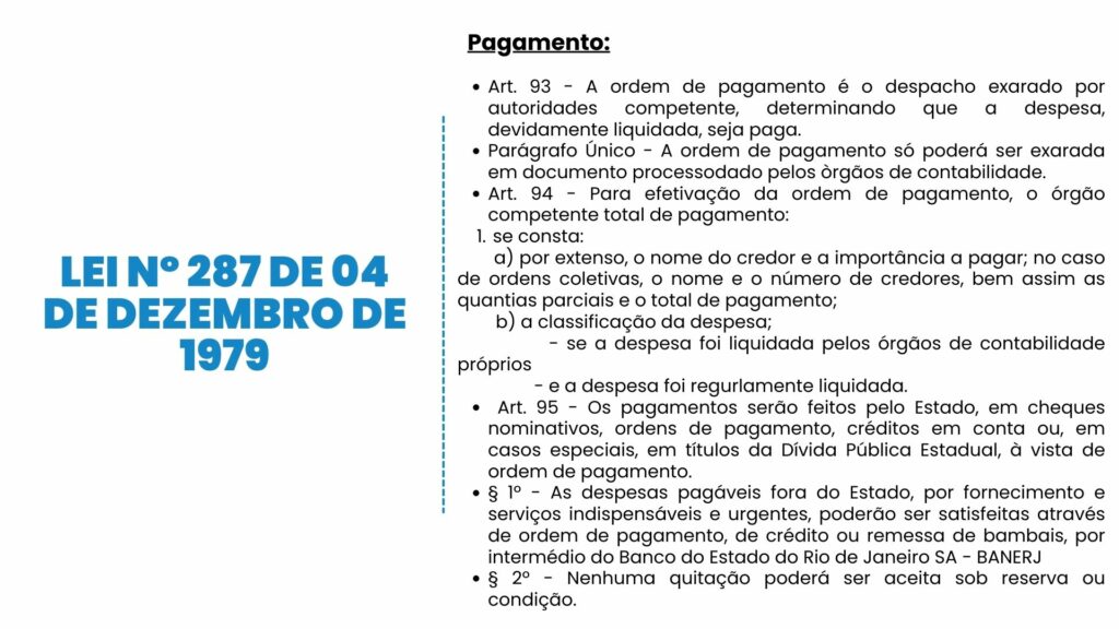 No Estado do Rio de Janeiro, a Lei n.º 287 de 04 de dezembro de 1979, regulamenta o Código de Administração Financeira e Contabilidade Pública. Além disso, a Contabilidade Geral do Estado, por meio de sua página disponibiliza diversos Manuais, tais como de: empenho da despesa; liquidação da despesa ; controle de contratos administrativos ; pagamento da despesa, e diversos outros.