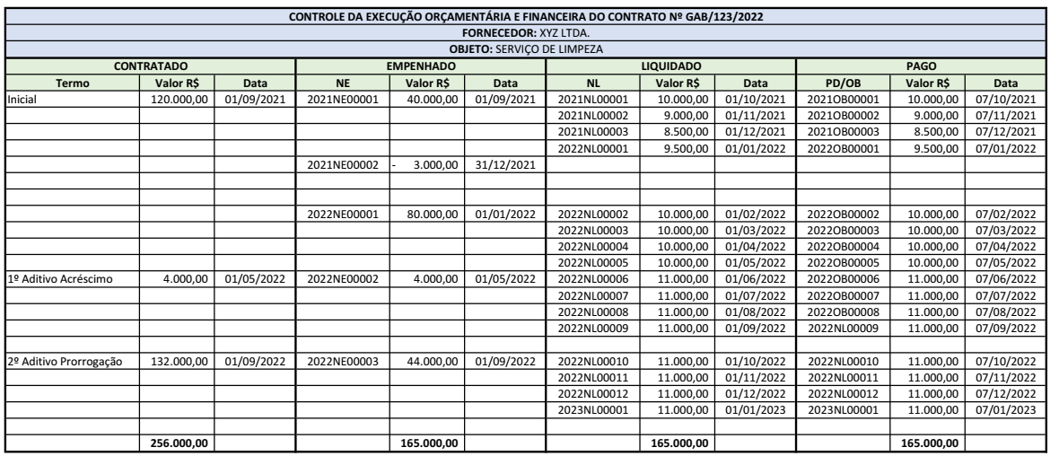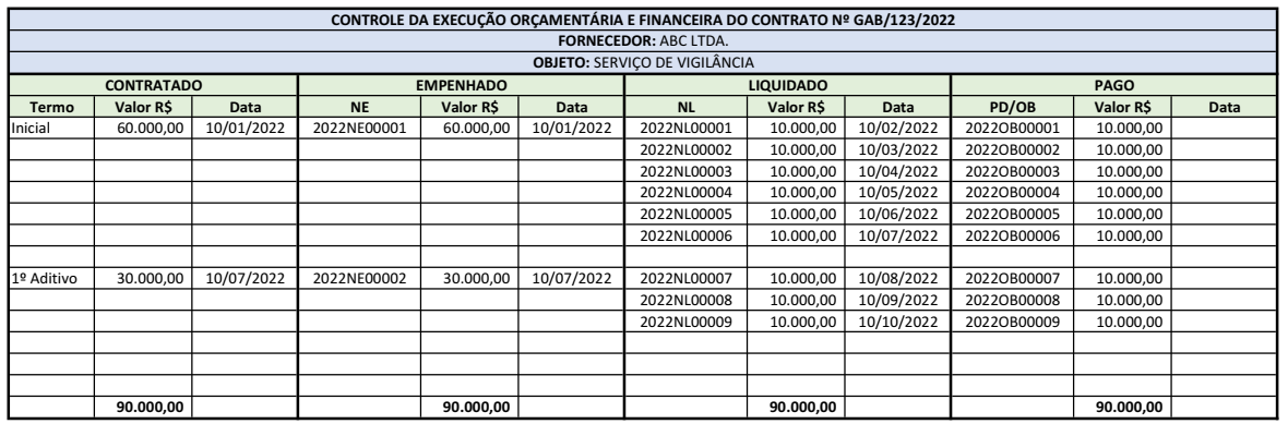 Numa contratação em que tudo transcorra da maneira planejada, um balanço da execução contábil da contratação demonstrará o mesmo valor para o empenho, para a liquidação e para o pagamento conforme o exemplo abaixo: