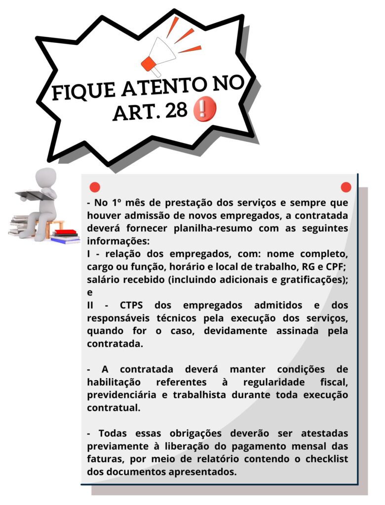 ▶️ assegurar, ao longo de toda a execução do contrato de aquisição de bens ou prestação de serviços, o cumprimento da reserva de cargos prevista em lei para pessoa com deficiência, para reabilitado da Previdência Social ou para aprendiz, bem como as reservas de cargos previstas em outras normas específicas;
