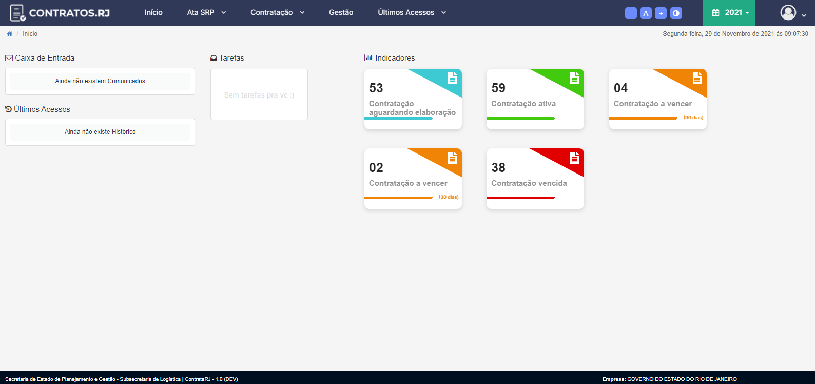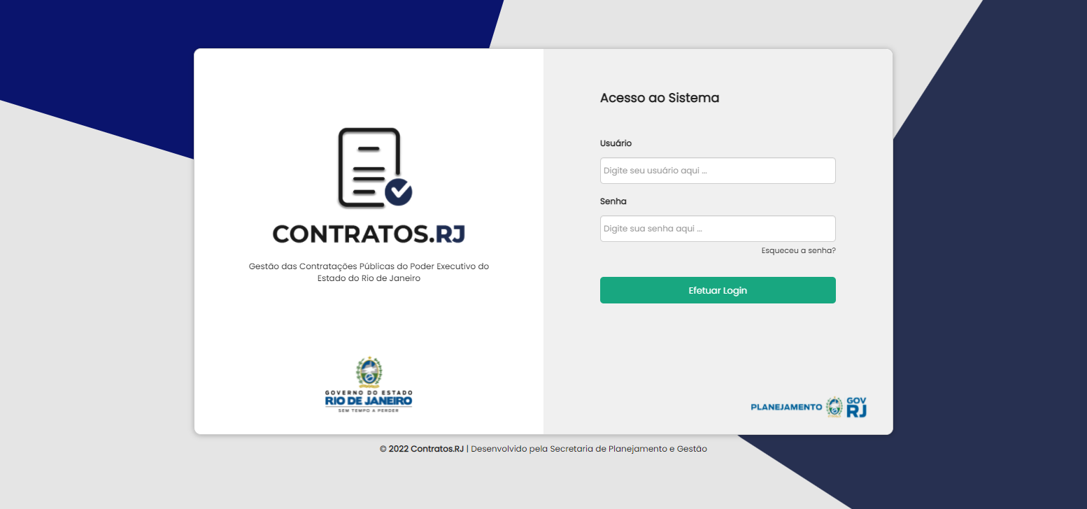 Atualmente o sistema federal Compras.gov.br processa informações da contratação até o encerramento da fase de seleção do fornecedor. A inclusão da contratação para os órgãos e entidades do Governo Federal acontece em um outro sistema chamado Compras.gov.br Contratos. Como esse sistema está desenhado para atender somente a realidade federal, a Secretaria de Estado de Planejamento e Gestão desenvolveu um novo sistema chamado Contratos.RJ.