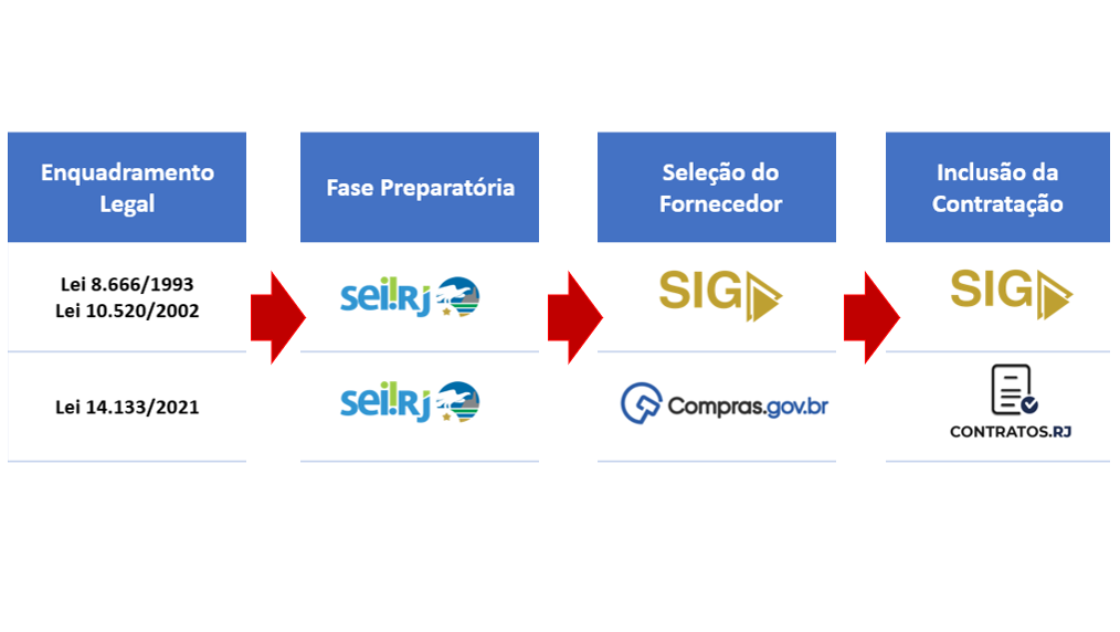 Neste momento todas as contratações do Poder Executivo do Estado do Rio de Janeiro continuam sendo realizadas pela Lei nº 8.666, de 21 de junho de 1993, a tradicional Lei de Licitações e Contratos, pela Lei nº 10.520, de 17 de julho de 2002, a Lei do Pregão, e pela Lei nº 12.462, de 04 de agosto de 2011, a Lei do Regime Diferenciado. de Contratações (RDC), e utilizando o Siga.