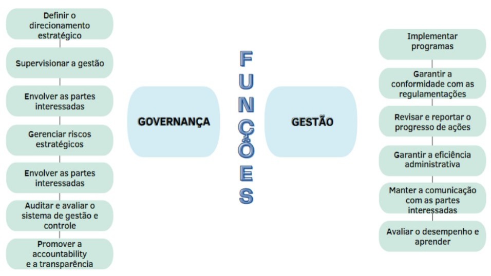 De um jeito bem simples de entender, com base no princípio da separação dos poderes de Montesquieu, dividindo-os em três: entendendo assim, a gestão é o poder executivo, enquanto que a governança é exercida pelos poderes legislativo e judiciário.