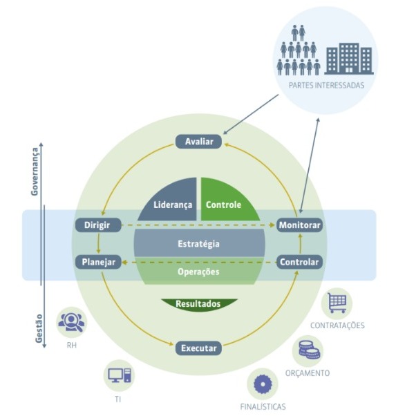 O TCU ainda acredita que há momentos em que as duas funções se interligam e, eventualmente, também se sobrepõem. Isso porque, as diretrizes (direção/dirigir) são fundamentais à estruturação organizacional tem relação com funções de governança. Já o controle da gestão subsidia o monitoramento pelas instâncias de governança. Dessa forma, criaram um “modelo de governança e gestão”, para melhor ilustrar.
