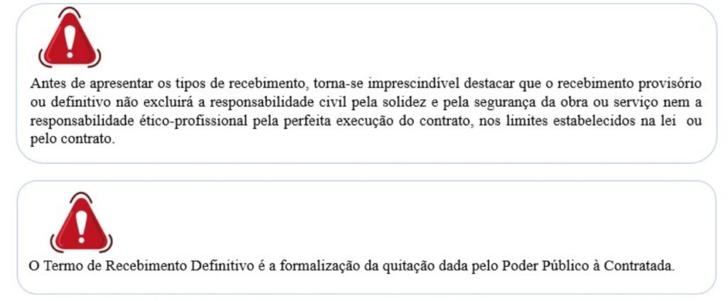 Por fim, cabe dizer que o recebimento definitivo, tanto em obras/serviços quanto em compras, marca a transferência da responsabilidade pelo objeto contratado da Administração Pública para o contratado. No entanto, essa transferência não significa que a responsabilidade do contratado se encerra por completo.
