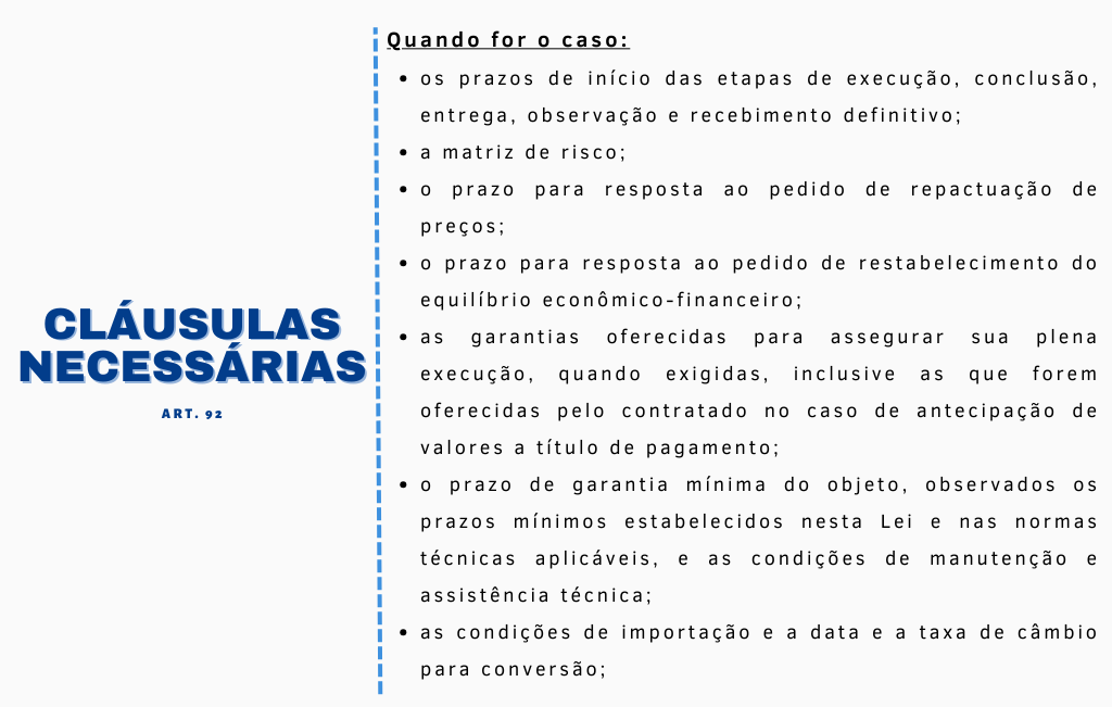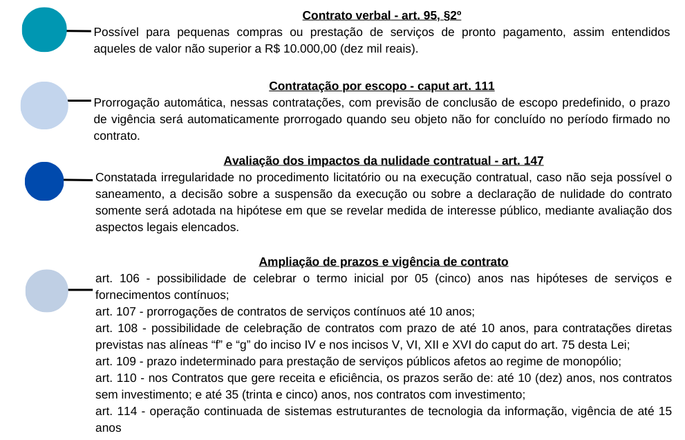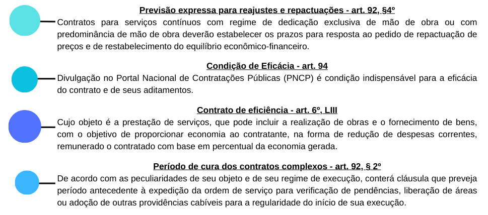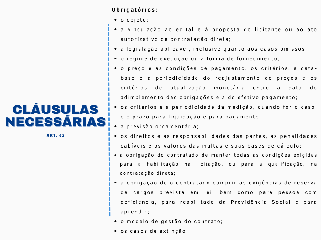 A Nova Lei de Licitações e Contratos, no Título III, trata dos contratos administrativos, se dividindo em: Capítulo I – da Formalização dos Contratos; Capítulo II – das Garantias; Capítulo III – da Alocação de Riscos; Capítulo IV – das Prerrogativas da Administração; Capítulo V – da Duração dos Contratos; Capítulo VI – da Execução dos Contratos; Capítulo VII – da Alteração dos Contratos e dos Preços; Capítulo VIII – das Hipóteses de Extinção dos Contratos; Capítulo IX – do Recebimento do Objeto do Contrato; Capítulo X – dos Pagamentos; Capítulo XI – da Nulidade dos Contratos; e Capítulo XII – Dos meios Alternativos de Resolução de Controvérsias.