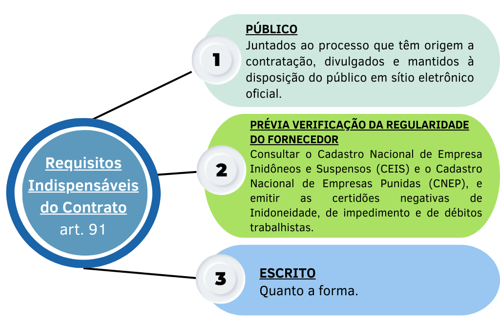 O Termo de Contrato é o instrumento celebrado entre a Administração Pública e o Fornecedor, que materializa e da início a relação de execução contratual e consequente entrega do objeto. O contrato administrativo reflete as condições previamente estabelecidas nos instrumentos que instruem a licitação, a saber: o Estudo Técnico Preliminar, o Projeto Executivo, o Termo de Referência, o Projeto Básico e o Edital. Destaca-se que o procedimento deve ser examinada pela área jurídica do órgão, antes da fase externa das contratações.