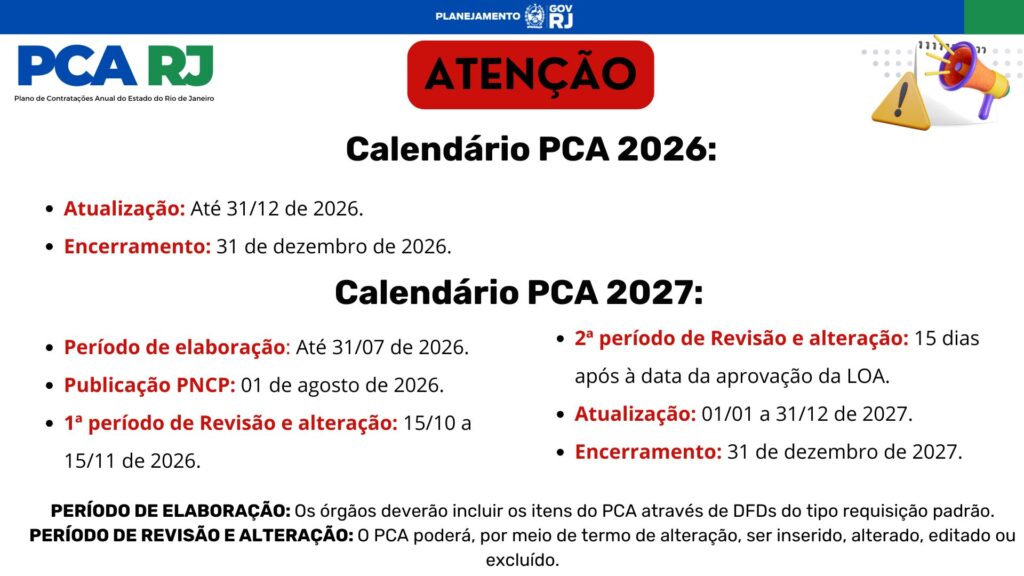 O PCA 2025 já se encontra publicado no PNCP, em caso de alteração, a nova publicação ocorre até o dia posterior da alteração realizada. O PCA 2026 será disponibilizado no Portal Nacional de Contratações Públicas (PNCP) em 01 de agosto de 2025.